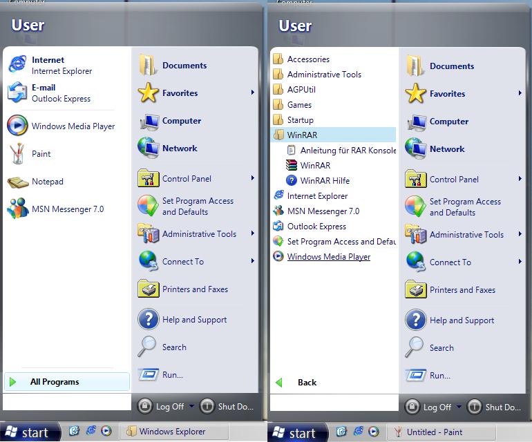 Das neue Startmenü - ein Klick auf "All Programs" und die neue Funktion zeigt sich (Anklicken zum vergrößern)